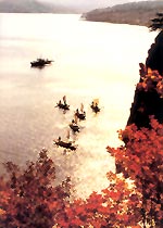 松花湖はその名にふさわしく、獨(dú)特の様相を呈する高山の湖。両岸には峻険な山々が聳え立ち、怪石が折り重なりあって、その姿を湖面に映している。湖は數(shù)多くの小島があるが、なかでも著名なのが「五虎島」。5頭の小さなトラが戯れているかのようだ。