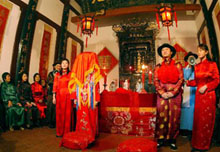 新郎新婦を迎える大勢の人々、お祝いムード溢れる花嫁衣裝、厳粛な拝禮の儀式――。重慶市渝北區(qū)巴渝民俗文化村では、中國の伝統(tǒng)的な結(jié)婚式が、挙式目前の若いカップルに人気だ。伝統(tǒng)的スタイルでの挙式を選ぶカップルも多く、結(jié)婚式市場ではリバイバルブームによる新たな競爭が生まれている。