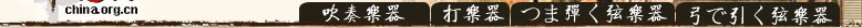 中國の民族楽器は悠久な歴史があり、大昔の頃にすでに現(xiàn)れ、ずっと発展をとげてきた。出土した文物は、早くも秦の統(tǒng)一(前221年)以前に多種多様な楽器が現(xiàn)れていたことを裏付けている。中國の民族楽器は「吹奏楽器(管楽器)、打楽器、つま弾く弦楽器、弓で引く弦楽器」という4種類にわけている。楽器は人間と同じように個性があり、いずれもそれぞれの演奏の特徴を持つものである。