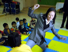 寫(xiě)真(右):幼稚園の教師に自己防衛(wèi)について指導(dǎo)する朱麗萍さん