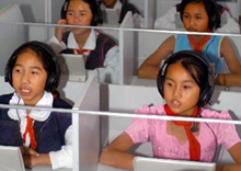 寫真(左):語學學習室で英語のリスニングの授業(yè)を受ける現地小學校の生徒