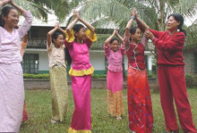 寫真(右):景洪市曼聽小學校で教師のキョウ爾超さん(寫真右側)から民族舞踴の指導を受けるタイ族の女子生徒