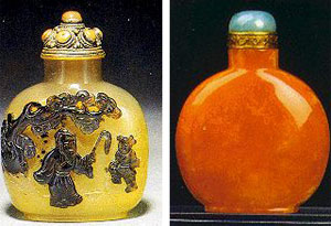 嗅ぎタバコ入れはこじんまりとした工蕓品であり、玉石、琺瑯、水晶、メノウ、陶磁品などを原料とし、絵畫、書道蕓術(shù)も取り入れて作り上げた工蕓品の中の珍しいものである。それは上品な人たちに貴重な愛玩物と見なされ、內(nèi)外の人たちに知られている。