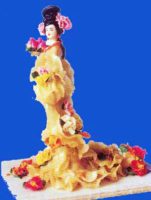 しんこ細(xì)工の人形は精製小麥粉、もち米粉などを材料とし、防腐剤も加え、それに水を混ぜて団子の形にねり上げ、なべに入れて蒸してから、必要にもとづいてそれぞれ異なった顔料を入れてさらにねりあげると、さまざまなイメージのしんこ細(xì)工の人形を作ることができる。しんこ細(xì)工の人形づくりには長い歴史があり、漢(前206-220)?唐(618-907)時代以來、ずっと民間の手蕓品として伝えられてきた。その多くは仏教?道教の物語、伝統(tǒng)演劇及び歴史上の人物をモデルとしたもの。指先によって作り上げる技法は簡潔で、作り上げられた人形は大きなものは手のひらぐらいの大きさで、小さなものは果実の核ぐらいの大きさであるとはいえ、顔には目、耳、鼻、口などがあり、イメージが鮮明で生き生きとしており、小さな民俗彫塑蕓術(shù)品の一つである。