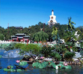 北海公園は、庭園の歴史のなかで蕓術的な傑作だと言える。面積は69ヘクタール(うち水面が39ヘクタール)。瓊華島は樹木に覆われ、宮殿や仏閣が並び、亭や樓閣が交錯して趣がある。中央に聳える白塔はまさに、北海公園のシンボル的存在。湖岸をめぐる垂れ下がった柳が湖に映して美しい。