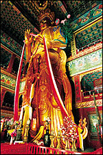 余り、高さ約5メートル、厚さ30センチ。金や銀、銅、鉄、スズの5種類の金屬で製作された「五百羅漢」は雍和宮で「3大絶品」の1つに數(shù)えられている。萬(wàn)仏閣に奉納された巨大な木彫仏像「マイダラ仏」。高さ18メートルで、地中にある部分を含めると背丈は26メートルになる。これも「3大絶品」の1つであり、1990年にギネスに登録された。