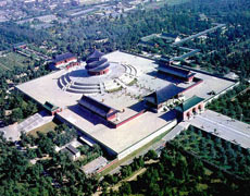 北京の南にある天壇は中國に現(xiàn)存する最大の祭祀用建築物群である。內(nèi)壇と外壇に分かれ、主な建築物は內(nèi)壇で、祭祀の行事は主に內(nèi)壇で行われる。南には圜丘、北には祈年殿がある。真中は「神道」と呼ばれる高くて幅の広い石を敷き詰めた道。天壇の南側(cè)は四角形、北側(cè)は円形を呈しており、昔の中國人の、天は円形で地は四角形という宇宙に対する考え方を象徴するものである。天壇の中で最も雄大な建築物は五穀豊穰を祈る本殿の祈年殿で、丸くて白い3重の土臺の上に、頂上部にはかわらが葺かれ、金めっきを