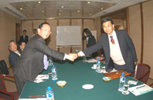 寫真:握手を交わす浦照洲副理事長(zhǎng)(右)と楽大信理事長(zhǎng)