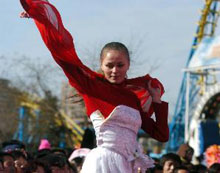 寫真(左):「西洋風(fēng)廟會」に出演するロシアの舞踴家(北京郊外?石景山遊園地)