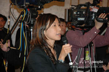 寫真(左):第10期全國政協(xié)第3回會議の記者會見で質問する香港の衛(wèi)星テレビ?鳳凰衛(wèi)視(フェニックステレビ)の閭丘露薇記者(=2日午後撮影)。閭丘記者は03年のイラク戦爭でバグダッドへ取材に行き、「戦場のバラ」と呼ばれた。