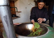 寫真(左):西湖竜井茶の産地?杭州市梅家塢村で、摘み取ったばかりの茶葉を煎る朱長水さん=24日撮影