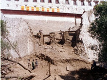 寫真(左):修理不足と雨水の影響で崩れた、布達(dá)拉宮正面の強(qiáng)慶塔拉姆坂道(2003年8月16日撮影)。同部分の修復(fù)はすでに完了したという。