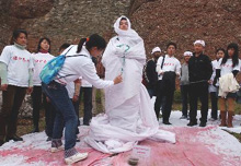 江蘇省南京市を流れる秦淮河の保護(hù)をテーマにしたパフォーマンス活動(dòng)が27日、同市石頭城公園で行われた。白い布に身を包み、赤い汚水をかけた白い布の中央に立って、淡水資源を保護(hù)し、秦淮河を再び澄みきった川に戻そうと人々に呼びかけるアーティストの姿も見(jiàn)られた。