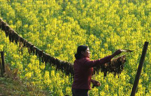 寫真(左):桃花源風(fēng)景區(qū)で特産の漬物を陰干しする農(nóng)家の女性=29日撮影