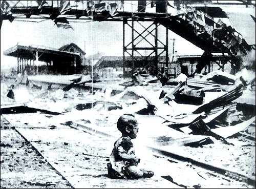 1937年8月28日、日本軍機(jī)が上海南駅を無差別爆撃。その場(chǎng)で死者200余人?無數(shù)の負(fù)傷者が出た。 寫真は、爆傷で泣ける子供