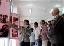 寫真(左):抗日戦爭(zhēng)の絵畫?寫真展を參観する福建省の元兵士と福州大學(xué)學(xué)生