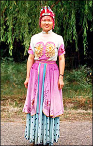 服飾 シボ族の人たちの服裝は満州族の影響が大きい。男性は左右にスリットの入った中國伝統(tǒng)スタイルの長衣と短衣を著ている。女性は長いチャイナドレスを著、刺繍模様のある靴を履き、耳環(huán)、腕環(huán)、指環(huán)などの裝飾品をよくつけている。