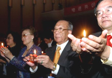 寫真:キャンドルに火をともして、臺灣同胞に「臺灣獨立反対、統(tǒng)一促進」を呼び掛けた第3回世界華僑華人社団聯(lián)誼大會の代表