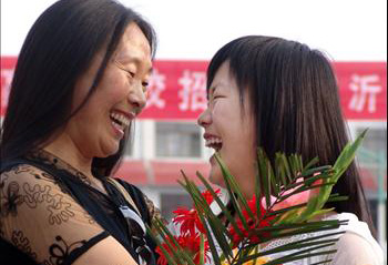 寫真(1):母親と抱き合う受験生の張暁潔さん=山東省臨沂市沂南県