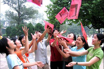 寫真(3):ペンケースを投げて試験終了を喜ぶ受験生ら=広西チワン族自治區(qū)昭平県