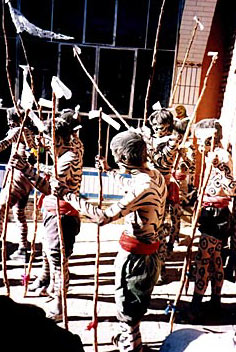 厳寒の季節(jié)に「於莬」に扮した若い男性が上半身を裸にし、ズボンのすそを巻き上げ、顔部、上半身と四肢の上にトラの斑紋をいっぱい描き、髪の毛を一束一束とブラシ狀に縛り、怒り狂っているトラに似た姿になる。一般に2頭の大きな「於莬」と5頭の小さな「於莬」がすべて長い剣と短刀を腰につけて、両手でそれぞれ1本の木の枝を持って、枝の上に経文が書いてある白い紙の札をつけている。一連の宗教色のある儀式のあと、彼らは廟の前の広場で「トラ踴り」を踴ることになる?!弗去檑xり」は古めかしい、ずっしりした、荒っぽい動作でトラの動きを真似、リズム感の強(qiáng)いどらと太鼓で伴奏し、片足を上げることと前への跳躍を交互にくり返し、動作の幅とテンポは祈とう師が人々の情緒と必要に基づいてたたき出した強(qiáng)弱、起伏、テンポの異なる太鼓の音のリズムによって決まる。