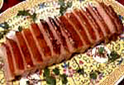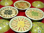 ツバメの巣の壽字と紅白のアヒルの細(xì)切り アヒルのささみ、板鴨のささみを細(xì)切りにし、トリのヒレ肉の筋を取り除いてすりつぶし、5分の1を取ってタマゴの黃み、調(diào)味料を入れて黃色の材料にし、10分間蒸して取り出し、すりつぶしたものに切り、タマゴの白みを入れてよく混ぜ、殘りの部分にタマゴの白み、3そろいのスープ、調(diào)味料を入れてトリの材料にする。ツバメの巣をきれいに洗って水をきって、千切り?duì)瞍艘绚?。白いトリの材料?分の4を使って皿の中で10個(gè)の臺(tái)形の塊をつくり、紅白の千切りの間隔のところにツバメの巣を置く。殘りのトリの材料を円形にし、「壽」の字を分け、黃色の材料を入れてせいろうで10分間蒸して取り出して「壽」の字を真中に置いてその周りによく蒸した塊を並べる。3そろいのスープを煮沸してドンブリの中に入れて出來(lái)上がりとなる。