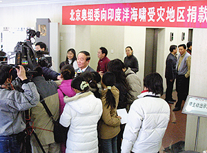 Во второй половине дня 30 декабря работники Оргкомитета олимпийских игр в Пекине пожертвовали средства для пострадавших от стихийного бедствия. Они таким образом внесли личный вклад в дело мира, дружбы и прогресса.
