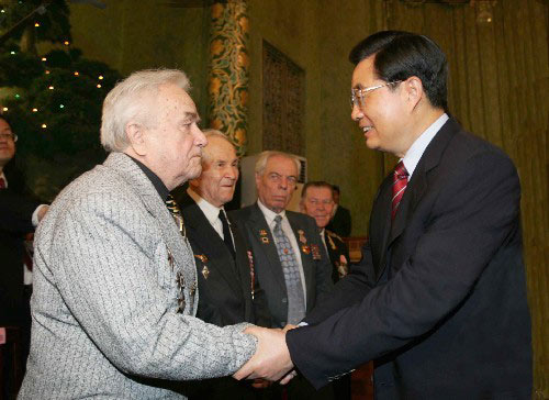 Председатель КНР Ху Цзиньтао 8 мая в посольстве КНР в Москве встретился с российскими ветеранами, в свое время участвовавшими в антияпонской войне и Великой Отечественной войне.