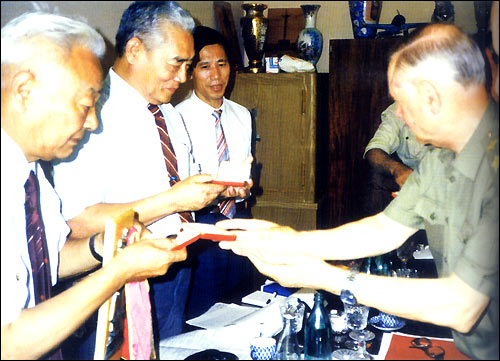Председатель Российского комитета ветеранов генерал армии Н. Сидиев вручает членам делегации Пекинской авиационной ассоциации свидетельства и ордена.
