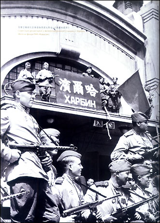 Советские десантники у железнодорожной станции г. Харбин. (Фото из фонда РИА ?Новости?)