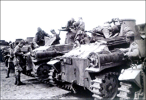Захваченные советскими солдатами японские танки после капитуляции Квантунской армии