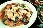 3) Мясо опустить в прогретое на 70% масло, обжарить, добавить лук, ломтики имбиря и чеснока, бамбуковые побеги, древесные грибы, моченый острый перец, все равномерно обжарить, влить приготовленный из мясного бульона соус. Довести до кипения и перелить в чашу.