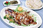 2) В другой сковороде обжарить во фритюре нарезанное соломкой мясо, добавить приготовленную из бобов густую сою, сушеные овощи, нарезанный соломкой моченый перец и все остудить, затем смесью нафаршировать утку. Утку зашить, поставить в разогретую духовку. Из готовой утки извлечь нарезанное соломкой мясо, сушеные овощи и выложить на маленькую тарелку. Мясо утки нарезать крупными кусками, выложить на другую тарелку. Подавать вместе с блинчиками для утки, нарезанным соломкой мясом, сушеными овощами и соусом.