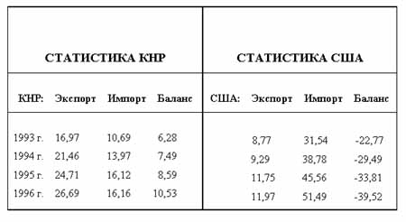 Согласно американской статистике, торговля США с КНР в период с 1979 по 1982 г. характеризовалась активным сальдо, в 1983 г. впервые зарегистрировано пассивное сальдо. В 1996 г. пассивное сальдо составило 39,5 млрд. долларов. Несколько иную картину обрисовала китайская статистика. За 14 лет (1979—1992) торговля Китая с США характеризовалась пассивным сальдо, в 1993 г. впервые зарегистрировано активное сальдо, в 1995 г. активное сальдо равнялось 10,5 млрд. долларов. Очевидно значительное несоответствие между статистическими данными двух стран (см. таблицу 1).