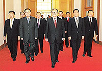 Под аплодисменты на трибуну президиума поднялись Цзян Цзэминь, Ху Цзиньтао, Ли Пэн, Чжу Жунцзи, Ли Жуйхуань, Вэй Цзяньсин, Ли Ланьцин, У Банго, Вэнь Цзябао, Цзя Цинлинь, Цзэн Цинхун, Хуан Цзюй, У Гуаньчжэн, Ли Чанчунь, Ло Гань.