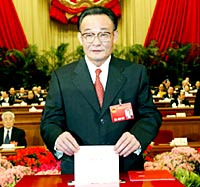 На состоявшемся сегодня, 15 марта в Доме народных собраний в Пекине пятом пленарном заседании 1-й сессии ВСНП 10-го созыва член Постоянного комитета Политбюро ЦК КПК У Банго был избран председателем Постоянного комитета ВСНП.
