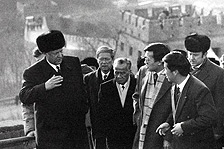 Президент Российской Федерации Б. Н. Ельцин и сопровождающие его лица во время посещения Великой Китайской стены в дни визита в КНР.