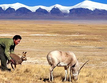 El custodio tibetano Dainzin Zhaxi, del Centro de Primeros Auxilios de Antílopes Tibetanos de Hoh Xil, pone a un cachorro originario junto al antílope tibetano Ailing para que tenga compa?ía