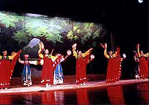 La Danza alegre de los agricultores, nacida de las faenas del campo, es una actividad de tradición popular y contiene elementos de las ceremonias antiguas con sacrificios. Habitualmente asume dos formas: Danza mímica con argumento, y representación de masas con danzas tradicionales apasionantes al comienzo del A?o Nuevo lunar o en celebración de la buena cosecha. Cuando es la ocasión, cada aldea envía un grupo de danza a los festejos locales. El grupo va precedido de una “bandera de orden” y una “bandera de agricultura”, en la cual está escrita la frase que dice “l(fā)a agricultura es la base de todo”, y luego del director de la banda, quien toca un gong peque?o. Bajo la conducción de éste, marchan los músicos que portan flautas, trompetas y tambores y la guardia de honor compuesta de bailarines disfrazados de toda clase de personajes. Por último llegan los artistas listos para presentar la danza con tamborete, la danza con tambores planos, la danza con tamboril, la danza con abanicos, la danza de las cigüe?as, la danza con gorros de elefante, la danza con máscaras y el drama de mímica.