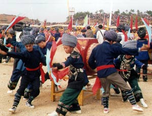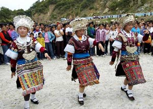 El grupo miao tiene una larga historia y una vasta cultura. Pero debido a su amplia distribución geográficas, sus ramas tienen cantos y danzas diferentes. En Guizhou los cantos y danzas de los miaos que viven en el sudeste de la provincia son más variados y atractivos. Desde la antigüedad, los miaos piensan que el tambor de cobre es un instrumento sagrado, y por tradición lo tocan para poner ambiente a las danzas en las ceremonias de homenaje a los ancestros y los dioses. Aunque las formas y los dibujos grabados del tambor de cobre varían en diferente periodos y zonas, contiene indefectiblemente el dibujo de sol radiante en la parte central. Con el correr del tiempo, muchas danzas dedicadas a las ceremonias de homenaje se han convertido en ceremonias populares o danzas recreativas. En algunas aldeas de terreno accidentado, para facilitar la congregación y el cultivo se nivelaron y adornaron ciertas tierras con lajas a semejanza de los “rayos del sol” que hay en la cara del tambor de cobre, dándoles el nombre de “planos de tambor de cobre”. Así, los aldeanos que bailan en los actos de homenaje pueden imaginarse como “hombres de plumas” para retornar al mundo de sus ancestros.