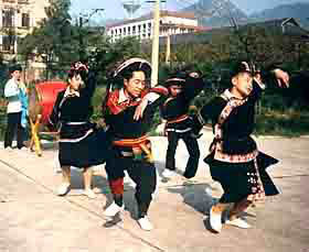 Entre los jóvenes miaos de ambos sexos la danza más común y de mayor predilección es el Caitang. Cuando esta danza se baila en la Fiesta del A?o Nuevo, una banda de mozos guapos aparece tocando sendas siringas y dando vuelta al plano. Al son del cilindro mangtong (de bambú con un resorte por dentro) de bajo colocado bajo un asparagus macho en el centro del plano y en medio del toque de los tambores de cobre, la melodía clara y altisonante resulta más fuerte y armoniosa. Después de los tocadores de siringas viene un grupo de chicas amorosas de unos 16 a?os, vestidas con chaquetas bordadas y apuestas cada cual con unos seis kilos de gorros, collares, placas, prendedores y pulseras de plata tintineantes, como si fuesen hadas bajadas del cielo.