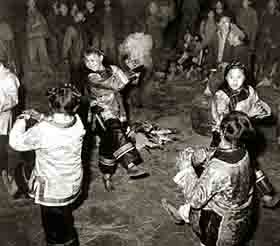 En la noche de la Fiesta del Cambio de A?o, mientras la gente se junta alrededor de las fogatas y sigue bailando con manos agitadas, los hombres se atan de arriba abajo con paja de arroz a imitación de “espantapájaros”, dejando descubiertos sólo los ojos. Con palos cortos en las manos y calabazas secas y llenas de agua prendidas a la cintura, brincan en torno de las hogueras para presentar la danza Maogusi  de sus antepasado, de culto a los genitales masculinos. Con el salto continuo y el vaivén adelante y atrás de sus cuerpos, los bailarines dejan salirse el agua de las calabazas para desear proliferación y cosechas abundantes a sus paisanos.