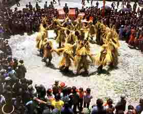 Tras medio día de los procedimientos necesarios se inicia la danza grande con manos agitadas  para entretener a los dioses.