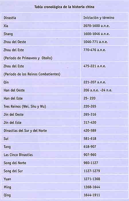 Xia, la dinastía más antigua, que se inició en el a?o 2070 a.n.e., tuvo como centro una región situada en el oeste de la actual provincia de Henan y el sur de la provincia de Shanxi. Su poderío y su influencia se extendieron hasta las orillas del río Amarillo (Huanghe). La dinastía Xia se encontraba en el umbral de la sociedad esclavista. Después de ella, florecieron sucesivamente las dinastías Shang (1600 a.n.e.-1046 a.n.e.) y Zhou del Oeste (1046 a.n.e.-771 a.n.e.), durante las cuales se desarrolló la esclavitud. Después, vino la dinastía Zhou del Este por haberse trasladado la capital hacia el este a Luoyi, oeste de la actual ciudad de Luoyang, provincia de Henan. Zhou del Este se dividió en dos épocas: el Período de Primavera y Oto?o (770 a.n.e.-476 a.n.e.) y el Período de los Reinos Combatientes (475 a.n.e.-221 a.n.e.), durante los cuales, debilitado el poder central de la corte, los diversos reinos lucharon entre sí en busca de la hegemonía. Estos dos últimos períodos se consideran como una etapa de transición de la sociedad esclavista a la feudal.