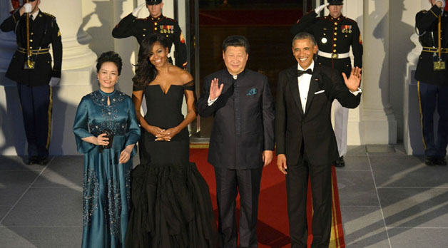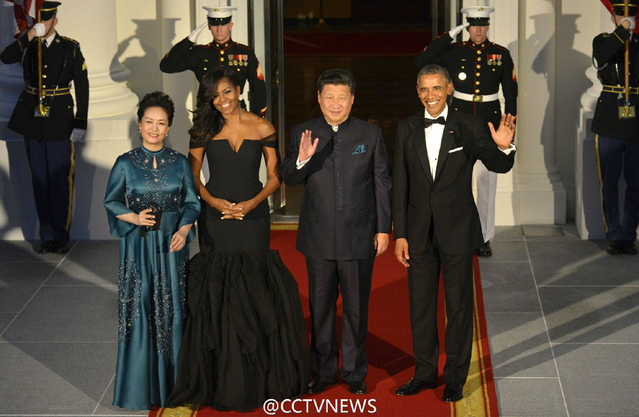 US President Barack Obama (R) and First Lady Michelle Obama (2nd from left) pose with Chinese President Xi Jinping (2nd from right) and his wife Peng Liyuan as they arrive for a state dinner at the White House in Washington, Sept 25, 2015.[Photo:Weibo.com/CCTVNEWS]